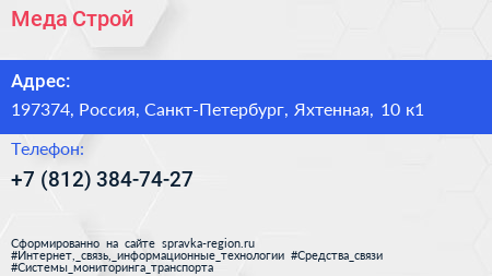Меда Строй по адресу 197374, Россия, Санкт-Петербург, Яхтенная, 10 к1 в дальнейшем Организация, размещена в следующих категориях: