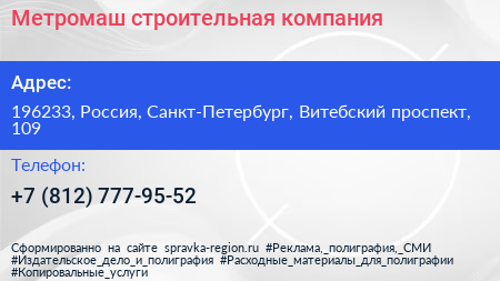 Метромаш, строительная компания по адресу 196233, Россия, Санкт-Петербург, Витебский проспект, 109 в дальнейшем Организация, размещена в следующих категориях: