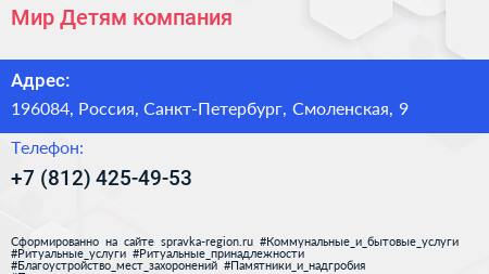Мир Детям, компания по адресу 196084, Россия, Санкт-Петербург, Смоленская, 9 в дальнейшем Организация, размещена в следующих категориях: