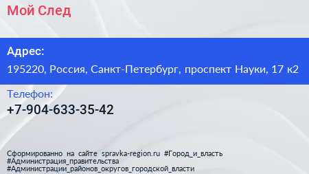Мой След по адресу 195220, Россия, Санкт-Петербург, проспект Науки, 17 к2 в дальнейшем Организация, размещена в следующих категориях: