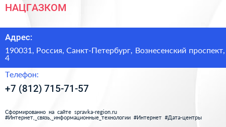 НАЦГАЗКОМ по адресу 190031, Россия, Санкт-Петербург, Вознесенский проспект, 4 в дальнейшем Организация, размещена в следующих категориях: