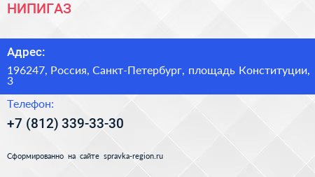 НИПИГАЗ по адресу 196247, Россия, Санкт-Петербург, площадь Конституции, 3 в дальнейшем Организация, размещена в следующих категориях: