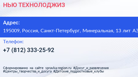 НЬЮ ТЕХНОЛОДЖИЗ по адресу 195009, Россия, Санкт-Петербург, Минеральная, 13 лит АЗ в дальнейшем Организация, размещена в следующих категориях: