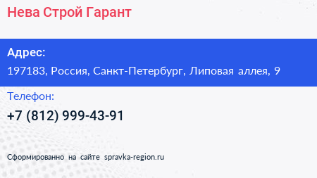 Нева Строй Гарант по адресу 197183, Россия, Санкт-Петербург, Липовая аллея, 9 в дальнейшем Организация, размещена в следующих категориях:
