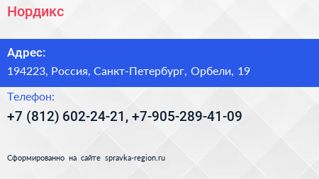 Нордикс по адресу 194223, Россия, Санкт-Петербург, Орбели, 19 в дальнейшем Организация, размещена в следующих категориях: