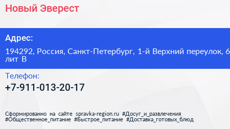 Новый Эверест по адресу 194292, Россия, Санкт-Петербург, 1-й Верхний переулок, 6 лит В в дальнейшем Организация, размещена в следующих категориях: