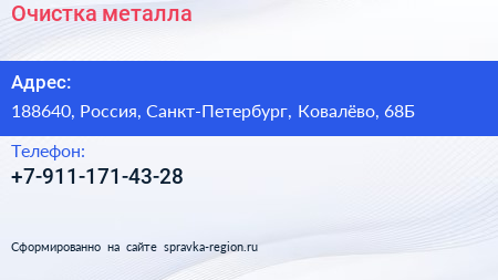 Очистка металла по адресу 188640, Россия, Санкт-Петербург, Ковалёво, 68Б в дальнейшем Организация, размещена в следующих категориях:
