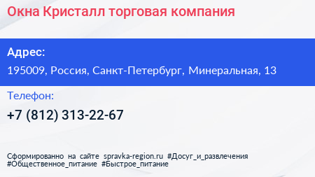 Окна-Кристалл, торговая компания по адресу 195009, Россия, Санкт-Петербург, Минеральная, 13 в дальнейшем Организация, размещена в следующих категориях: