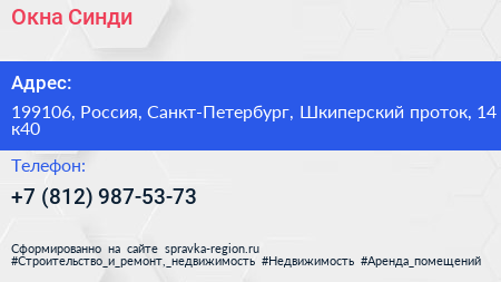 Окна Синди по адресу 199106, Россия, Санкт-Петербург, Шкиперский проток, 14 к40 в дальнейшем Организация, размещена в следующих категориях: