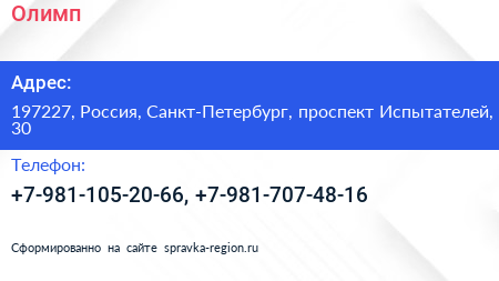 Олимп по адресу 197227, Россия, Санкт-Петербург, проспект Испытателей, 30 в дальнейшем Организация, размещена в следующих категориях: