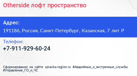 Otherside, лофт-пространство по адресу 191186, Россия, Санкт-Петербург, Казанская, 7 лит Р в дальнейшем Организация, размещена в следующих категориях: