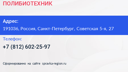ПОЛИБИОТЕХНИК по адресу 191036, Россия, Санкт-Петербург, Советская 5-я, 27 в дальнейшем Организация, размещена в следующих категориях: