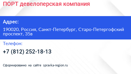 ПОРТ, девелоперская компания по адресу 190020, Россия, Санкт-Петербург, Старо-Петергофский проспект, 35в в дальнейшем Организация, размещена в следующих категориях: