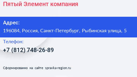 Пятый Элемент, компания по адресу 196084, Россия, Санкт-Петербург, Рыбинская улица, 5 в дальнейшем Организация, размещена в следующих категориях: