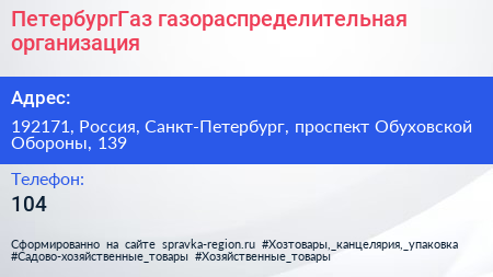 ПетербургГаз, газораспределительная организация по адресу 192171, Россия, Санкт-Петербург, проспект Обуховской Обороны, 139 в дальнейшем Организация, размещена в следующих категориях: