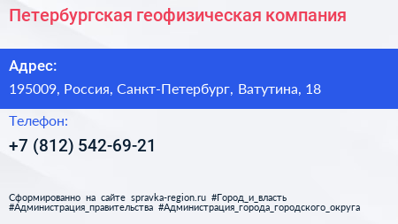 Петербургская геофизическая компания по адресу 195009, Россия, Санкт-Петербург, Ватутина, 18 в дальнейшем Организация, размещена в следующих категориях: