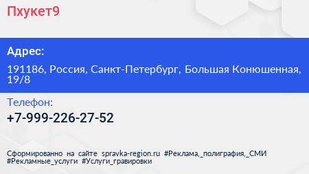 Пхукет9 по адресу 191186, Россия, Санкт-Петербург, Большая Конюшенная, 19/8 в дальнейшем Организация, размещена в следующих категориях: