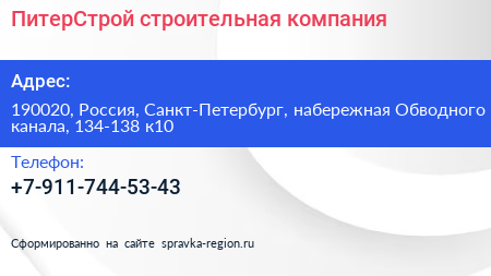 ПитерСтрой, строительная компания по адресу 190020, Россия, Санкт-Петербург, набережная Обводного канала, 134-138 к10 в дальнейшем Организация, размещена в следующих категориях: