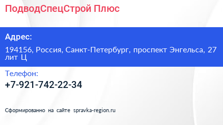 ПодводСпецСтрой Плюс по адресу 194156, Россия, Санкт-Петербург, проспект Энгельса, 27 лит Ц в дальнейшем Организация, размещена в следующих категориях: