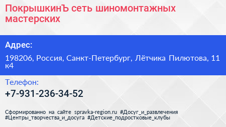 ПокрышкинЪ, сеть шиномонтажных мастерских по адресу 198206, Россия, Санкт-Петербург, Лётчика Пилютова, 11 к4 в дальнейшем Организация, размещена в следующих категориях: