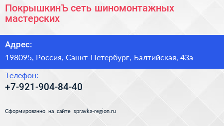ПокрышкинЪ, сеть шиномонтажных мастерских по адресу 198095, Россия, Санкт-Петербург, Балтийская, 43а в дальнейшем Организация, размещена в следующих категориях: