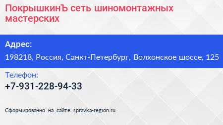 ПокрышкинЪ, сеть шиномонтажных мастерских по адресу 198218, Россия, Санкт-Петербург, Волхонское шоссе, 125 в дальнейшем Организация, размещена в следующих категориях: