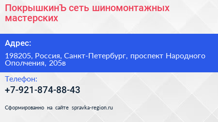 ПокрышкинЪ, сеть шиномонтажных мастерских по адресу 198205, Россия, Санкт-Петербург, проспект Народного Ополчения, 205в в дальнейшем Организация, размещена в следующих категориях: