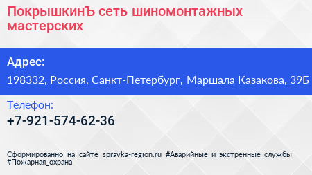 ПокрышкинЪ, сеть шиномонтажных мастерских по адресу 198332, Россия, Санкт-Петербург, Маршала Казакова, 39Б в дальнейшем Организация, размещена в следующих категориях: