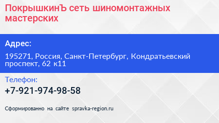 ПокрышкинЪ, сеть шиномонтажных мастерских по адресу 195271, Россия, Санкт-Петербург, Кондратьевский проспект, 62 к11 в дальнейшем Организация, размещена в следующих категориях:
