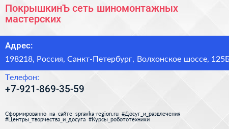 ПокрышкинЪ, сеть шиномонтажных мастерских по адресу 198218, Россия, Санкт-Петербург, Волхонское шоссе, 125Б в дальнейшем Организация, размещена в следующих категориях: