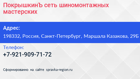 ПокрышкинЪ, сеть шиномонтажных мастерских по адресу 198332, Россия, Санкт-Петербург, Маршала Казакова, 29Б в дальнейшем Организация, размещена в следующих категориях: