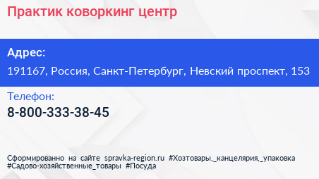 Практик, коворкинг-центр по адресу 191167, Россия, Санкт-Петербург, Невский проспект, 153 в дальнейшем Организация, размещена в следующих категориях: