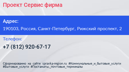 Проект Сервис, фирма по адресу 190103, Россия, Санкт-Петербург, Рижский проспект, 2 в дальнейшем Организация, размещена в следующих категориях:
