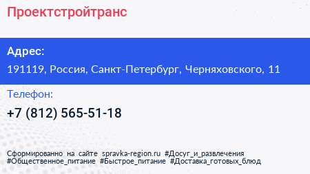 Проектстройтранс по адресу 191119, Россия, Санкт-Петербург, Черняховского, 11 в дальнейшем Организация, размещена в следующих категориях: