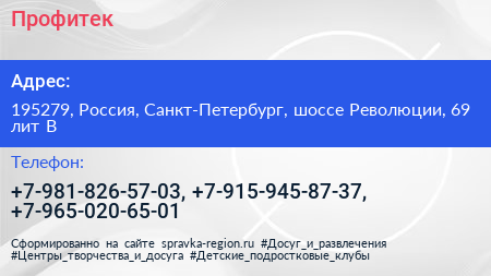 Профитек по адресу 195279, Россия, Санкт-Петербург, шоссе Революции, 69 лит В в дальнейшем Организация, размещена в следующих категориях: