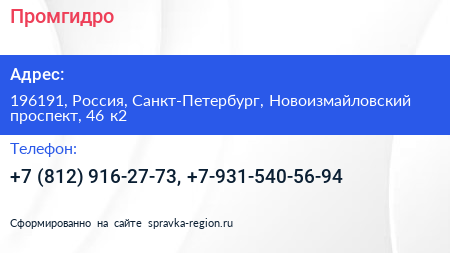 Промгидро по адресу 196191, Россия, Санкт-Петербург, Новоизмайловский проспект, 46 к2 в дальнейшем Организация, размещена в следующих категориях: