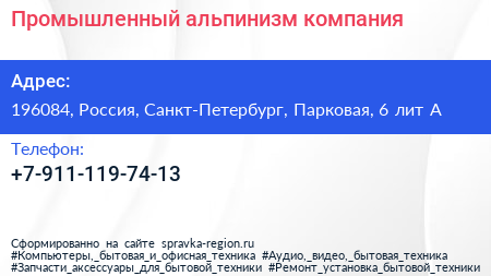 Промышленный альпинизм, компания по адресу 196084, Россия, Санкт-Петербург, Парковая, 6 лит А в дальнейшем Организация, размещена в следующих категориях: