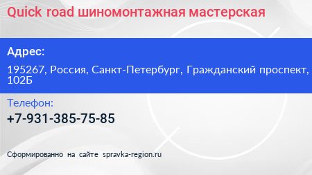 Quick road, шиномонтажная мастерская по адресу 195267, Россия, Санкт-Петербург, Гражданский проспект, 102Б в дальнейшем Организация, размещена в следующих категориях: