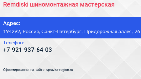 Remdiski, шиномонтажная мастерская по адресу 194292, Россия, Санкт-Петербург, Придорожная аллея, 26 в дальнейшем Организация, размещена в следующих категориях: