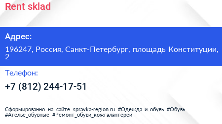 Rent-sklad по адресу 196247, Россия, Санкт-Петербург, площадь Конституции, 2 в дальнейшем Организация, размещена в следующих категориях: