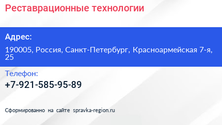 Реставрационные технологии по адресу 190005, Россия, Санкт-Петербург, Красноармейская 7-я, 25 в дальнейшем Организация, размещена в следующих категориях: