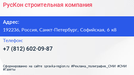 РусКон, строительная компания по адресу 192236, Россия, Санкт-Петербург, Софийская, 6 к8 в дальнейшем Организация, размещена в следующих категориях: