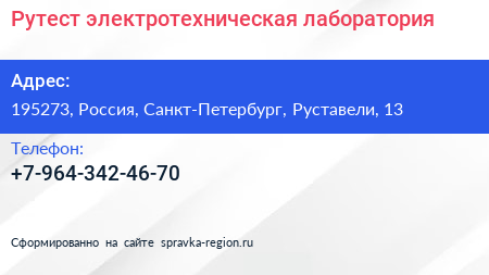 Рутест, электротехническая лаборатория по адресу 195273, Россия, Санкт-Петербург, Руставели, 13 в дальнейшем Организация, размещена в следующих категориях: