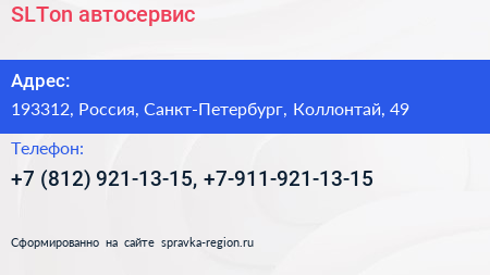SLTon, автосервис по адресу 193312, Россия, Санкт-Петербург, Коллонтай, 49 в дальнейшем Организация, размещена в следующих категориях: