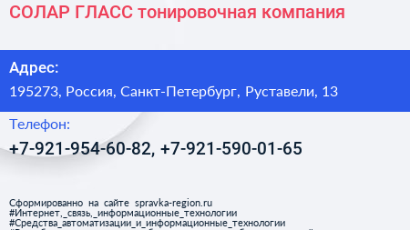СОЛАР ГЛАСС, тонировочная компания по адресу 195273, Россия, Санкт-Петербург, Руставели, 13 в дальнейшем Организация, размещена в следующих категориях: