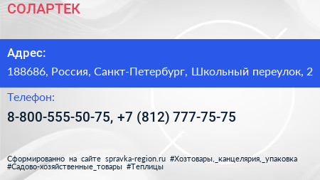 СОЛАРТЕК по адресу 188686, Россия, Санкт-Петербург, Школьный переулок, 2 в дальнейшем Организация, размещена в следующих категориях: