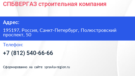 СПБВЕРГАЗ, строительная компания по адресу 195197, Россия, Санкт-Петербург, Полюстровский проспект, 50 в дальнейшем Организация, размещена в следующих категориях: