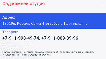 Сад камней, студия по адресу 195196, Россия, Санкт-Петербург, Таллинская, 5 в дальнейшем Организация, размещена в следующих категориях: