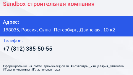 Sandbox, строительная компания по адресу 198035, Россия, Санкт-Петербург, Двинская, 10 к2 в дальнейшем Организация, размещена в следующих категориях: