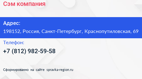 Сэм, компания по адресу 198152, Россия, Санкт-Петербург, Краснопутиловская, 69 в дальнейшем Организация, размещена в следующих категориях: